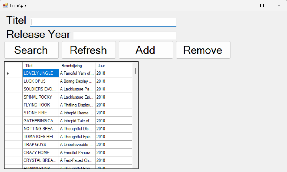 Mijn filmapplicatie werkt met CRUD-functies. ik heb geleerd hoe je films kunt toevoegen, opzoeken en verwijderen. De applicatie is via de Sakila-database in MySQL gekoppeld aan de C#-code van de applicatie.