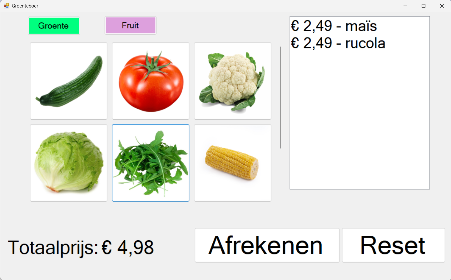 Dit is mijn beste applicatie tot nu toe. Deze applicatie is een kassa voor een groenteboer met dyslexie. Ik heb geleerd hoe ik knoppen vanuit de database kan genereren en tonen in de applicatie. Ook heb ik geleerd hoe ik producten kan opslaan in de database.